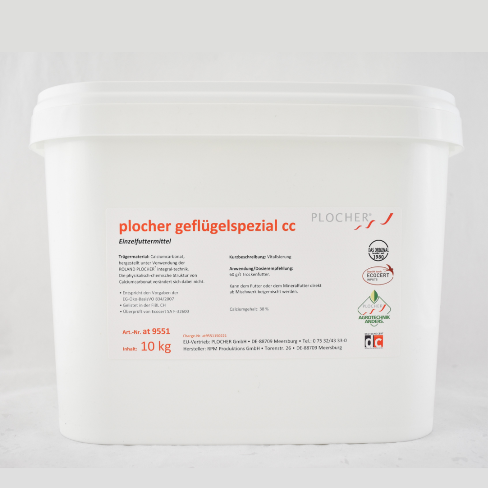plocher geflügelspezial cc: Basiert auf Calciumcarbonat (Kohlensaurer Kalk). Diese Pulverform ist ideal zum Einmischen in das Trockenfutter oder Mineralfutter (auch direkt ab Mischwerk).